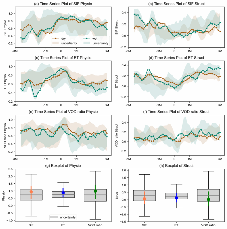 随着全球干旱事件频率和强度持续增加,干旱胁迫下的植被响应研究受到广泛关注。植被响应通常包括生理响应和结构响应两个方面。传统遥感方法依赖叶面积指数(LAI)、太阳诱导荧光(SIF)和近红外植被指数(NIRv)等指标直接分析,难以分离其中生理响应和结构响应驱动的遥感信号贡献。同时,以往研究大多孤立分析光合、蒸腾和水分调节等植被功能,未能揭示这些功能在干旱条件下的相互作用机制,从而限制了对植被干旱抵抗策略的理解。