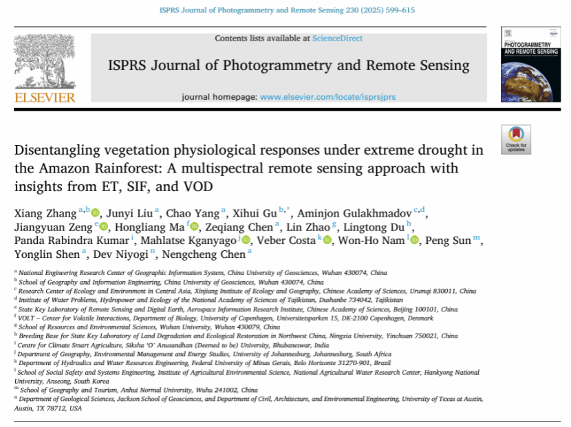 近日,中国地质大学(武汉)国家地理信息系统工程技术研究中心张翔教授团队在遥感领域国际顶级期刊《ISPRS Journal of Photogrammetry and Remote Sensing》(SCI一区TOP,IF=12.2)发表了题为《Disentangling vegetation physiological responses under extreme drought in the Amazon Rainforest: A multispectral remote sensing approach with insights from ET, SIF, and VOD》的研究成果。该研究量化对比了植被在极端干旱条件下的生理响应与结构响应的遥感信号差异。研究发现,在干旱期间,亚马逊雨林植被的功能异常主要来自生理响应,其对于光合作用、蒸腾作用和水分调节功能的贡献在湿润区和干旱区分别达到74.1%和67.7%、64.2%和62.6%、71.8%和66.2%。该研究为理解全球最大热带雨林应对极端干旱的适应机制提供了新视角。